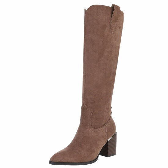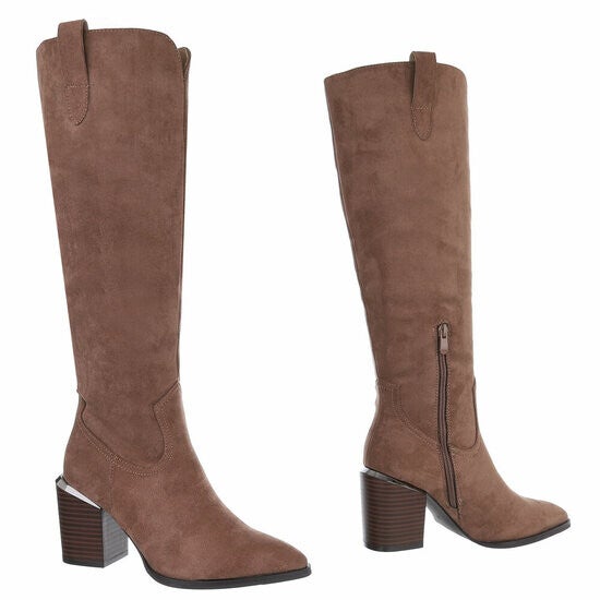 De warme kaki-bruine kleur, comfortabele blokhak en subtiel gouden randje maken deze laars perfect voor zowel dagelijks gebruik als speciale gelegenheden.