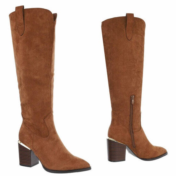 Deze camel suède-look laars heeft een elegante hoge schacht, een comfortabele blokhak en een moderne pointed toe. Perfect te combineren met jurken, rokken en jeans.
