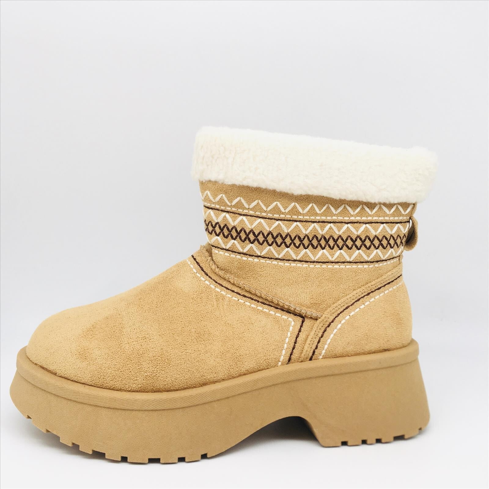 Stijlvolle enkellaars in een khaki kleur met een comfortabele platformzool. De laars is afgewerkt met decoratieve stiksels en een warme teddy voering aan de schacht voor een cozy winterlook. De stevige zool biedt extra grip en draagcomfort, ideaal voor koude dagen.