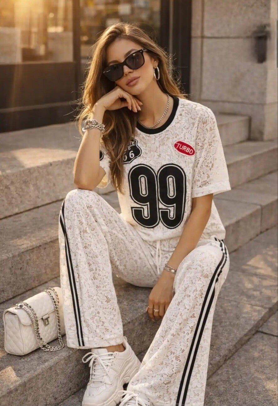 Prachtige tweedelige set bestaande uit een kanten T-shirt en broek, perfect voor een moderne en originele look. Het T-shirt met korte mouwen is versierd met sportieve patches en cijfers, wat een urban en trendy touch geeft.