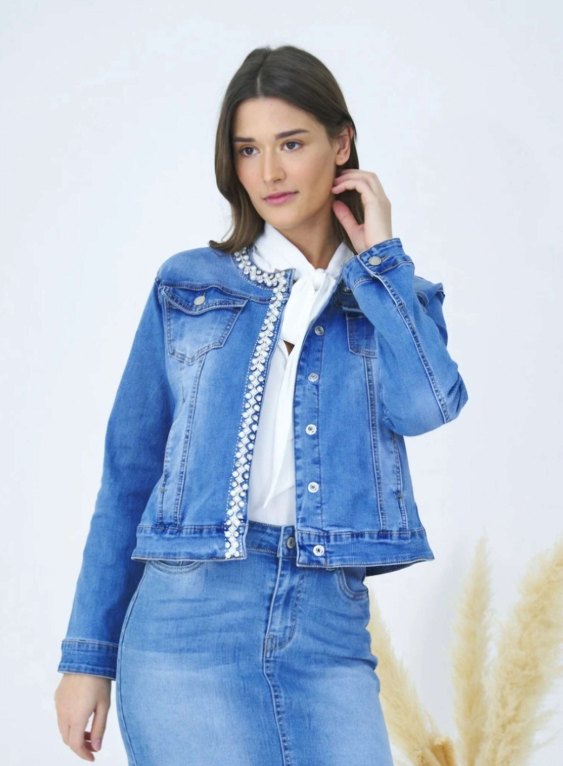 Geef je outfit een stijlvolle upgrade met deze moderne denim jacket. De subtiele details langs de rand zorgen voor een vrouwelijke en luxe uitstraling. Perfect te combineren met zowel casual als chique looks.