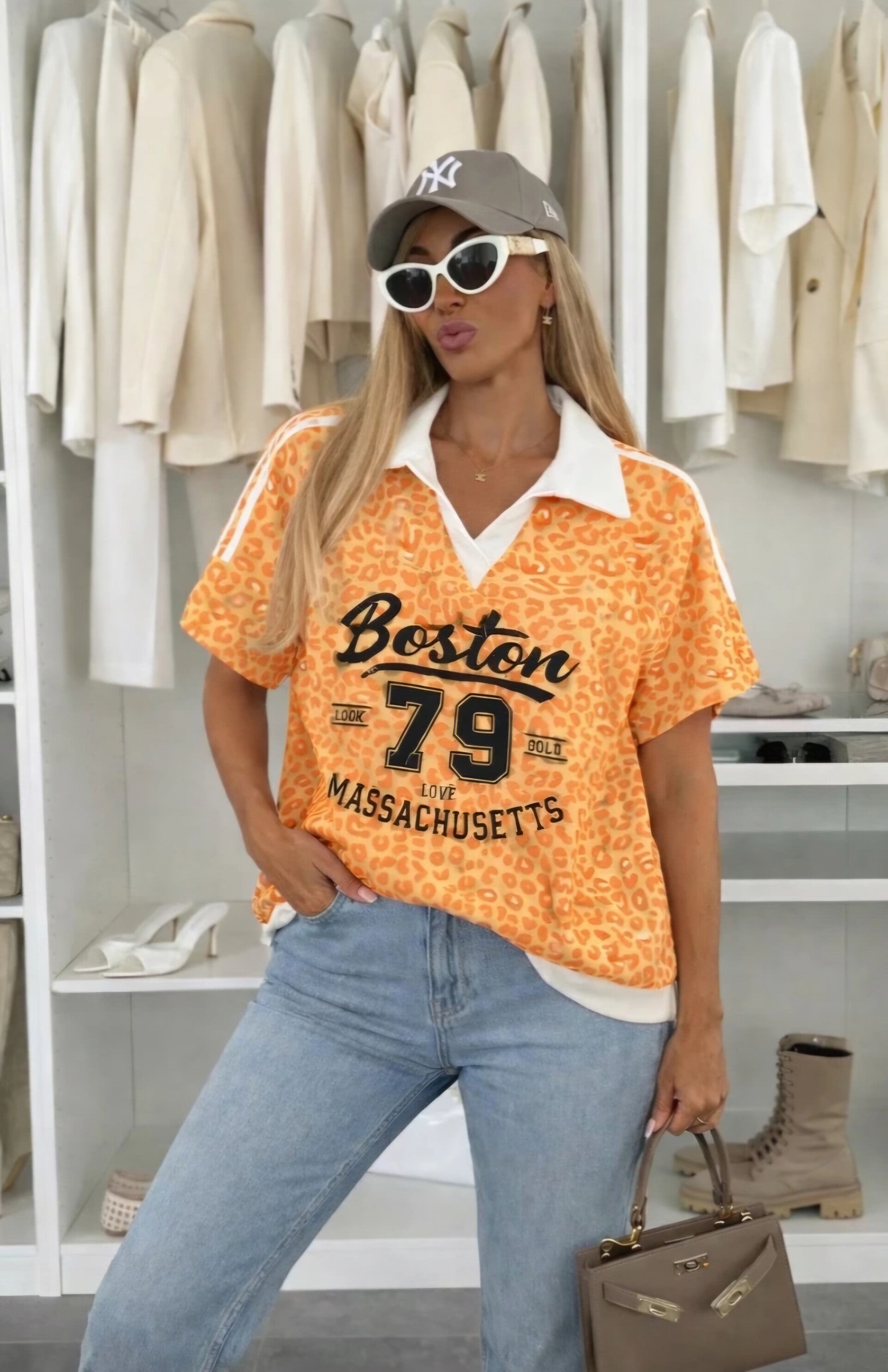 Geef je outfit een trendy upgrade met dit opvallende Boston 79 T-shirt. De speelse luipaardprint in frisse oranje tinten, gecombineerd met de sportieve opdruk, zorgt voor een perfecte mix van casual en stijlvol.